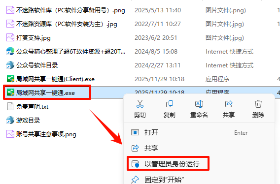 2.打开刚刚解压的文件夹,鼠标右键点击“局域网共享一键通.exe”选择“以管理员身份运行”