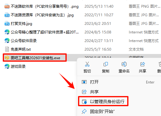 2.打开刚刚解压的文件夹,鼠标右键点击“图吧工具箱202601安装包.exe“选择“以管理员身份运行“