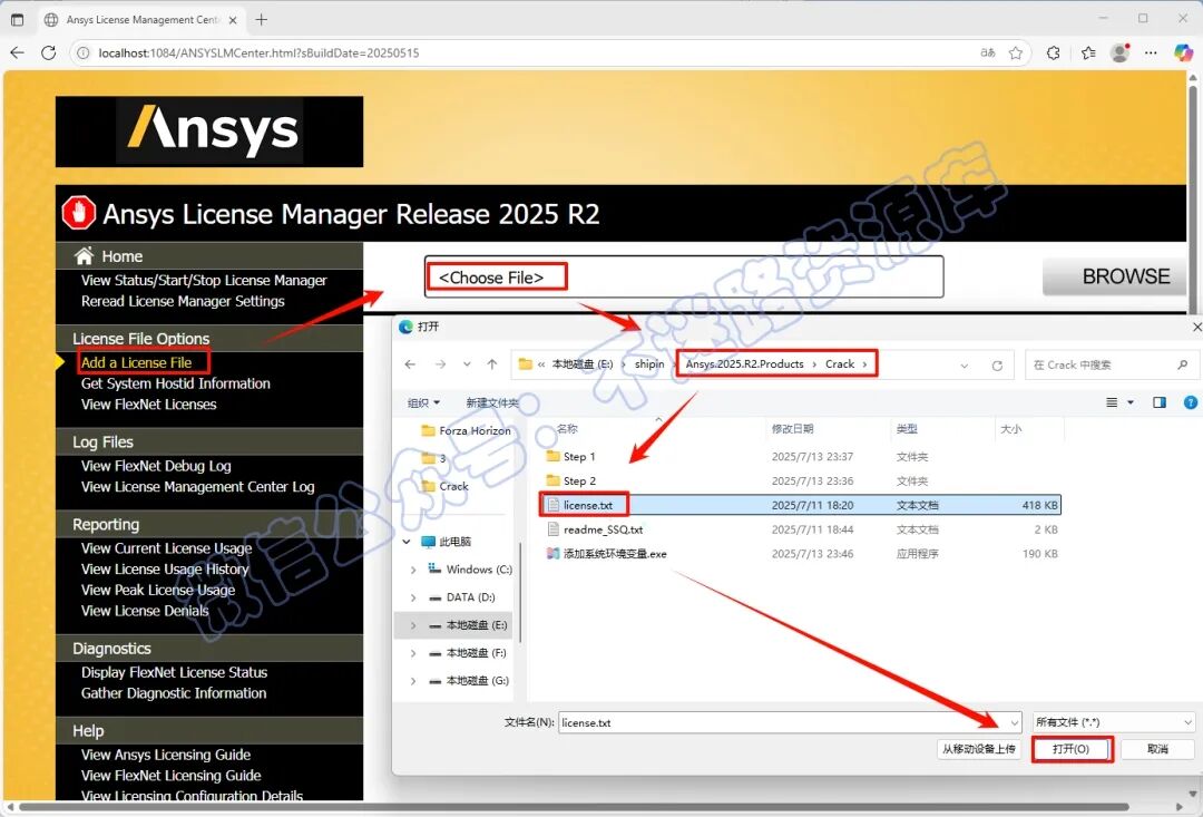 20.返回证书管理中心“ANSYS License Manager Center“界面,点击"Add a License File" ,点击"Choose File" ,浏览选择上一步保存后的"license.txt" 文件(即“Ansys.2025.R2.Products—Crack”文件夹里面),点击 "打开"