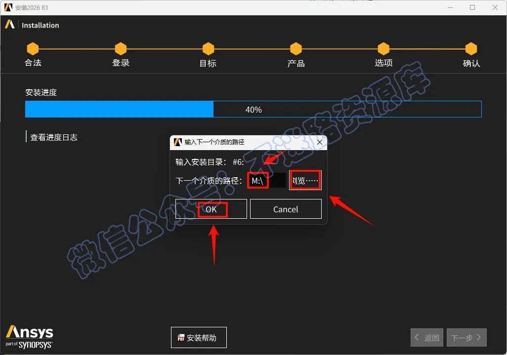 52.回到软件安装界面,点击“浏览”选择“M”盘(上一步显示的盘符),点击“选择文件夹”,点击“OK”,软件继续安装