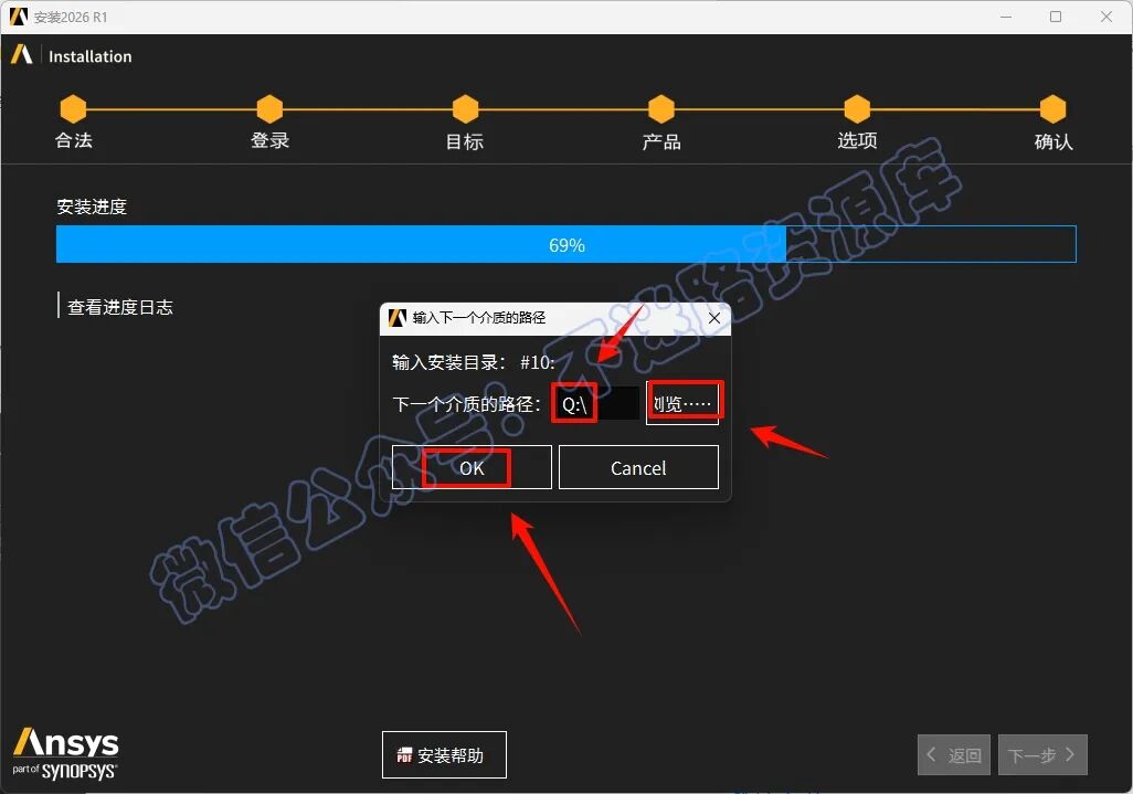 65.回到软件安装界面,点击“浏览”选择“Q”盘(上一步显示的盘符),点击“选择文件夹”,点击“OK”,软件继续安装