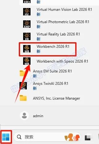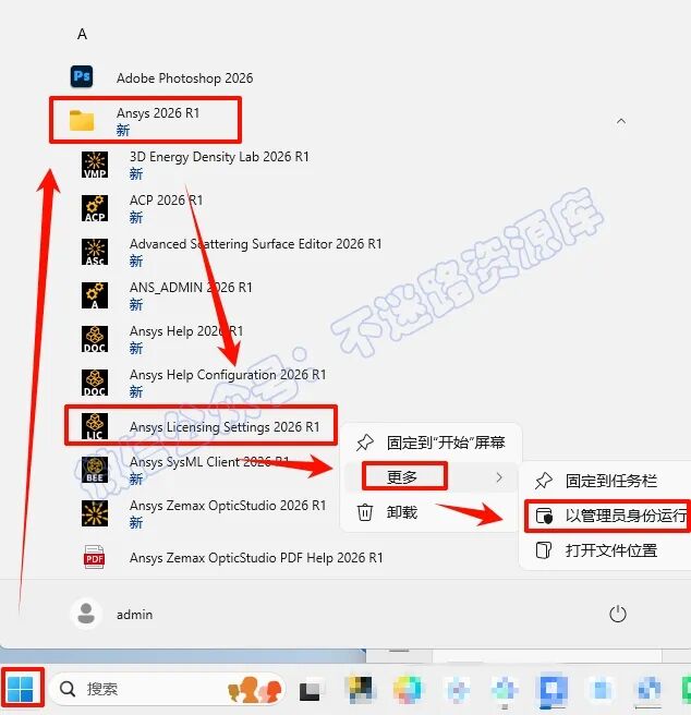78.点击“开始“菜单栏,点击展开“Ansys 2026 R1“,鼠标右键选中“Ansys Licensing Settings 2026 R1“程序选择“以管理员身份运行”