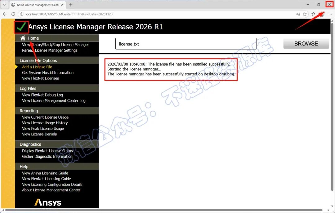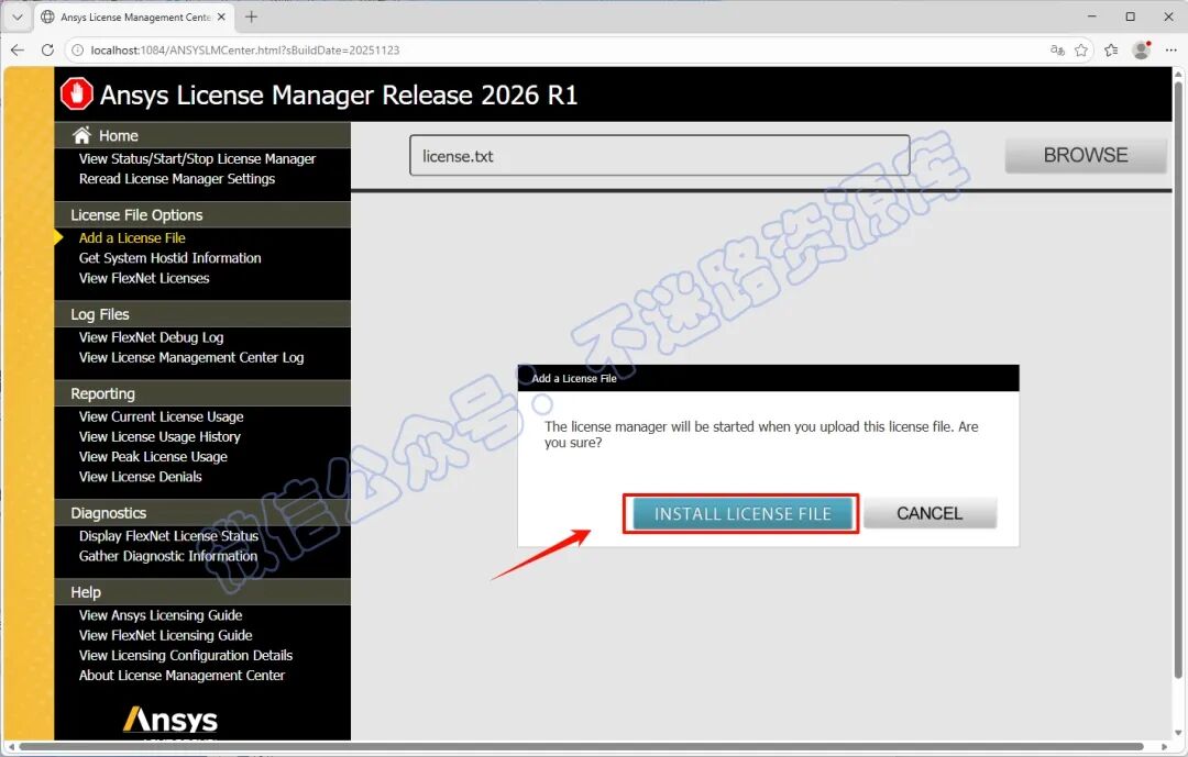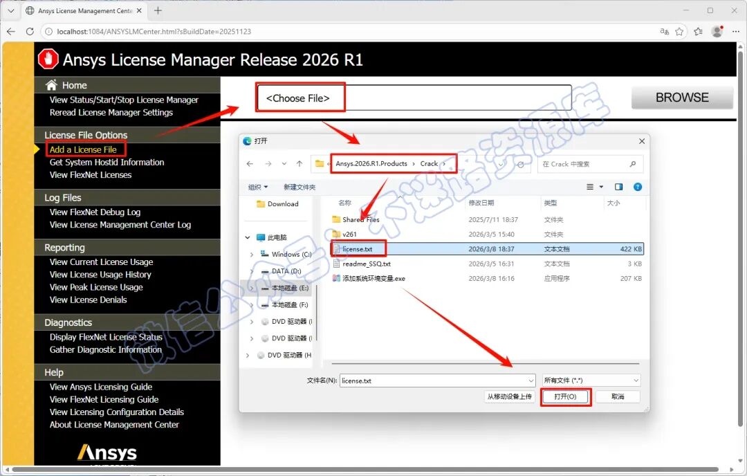 20.返回证书管理中心“ANSYS License Manager Center“界面,点击"Add a License File" ,点击"Choose File" ,浏览选择上一步保存后的"license.txt" 文件(即“Ansys.2026.R1.Products—Crack”文件夹里面),点击 "打开"