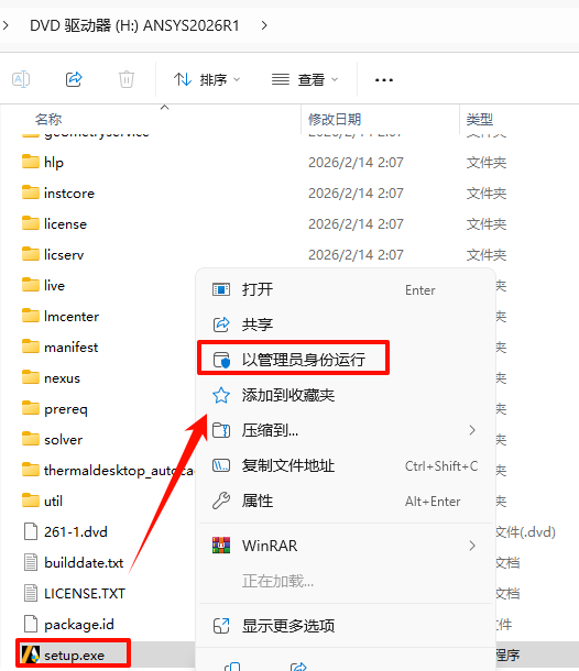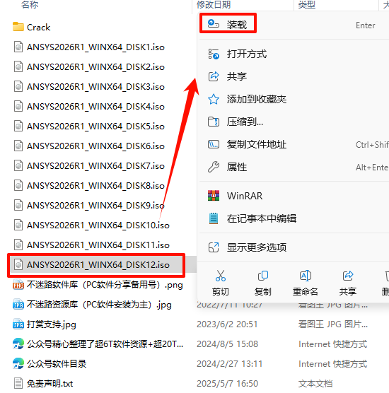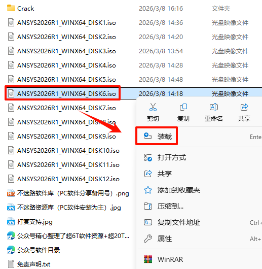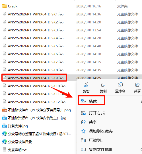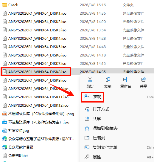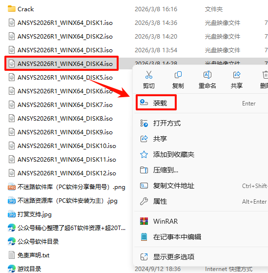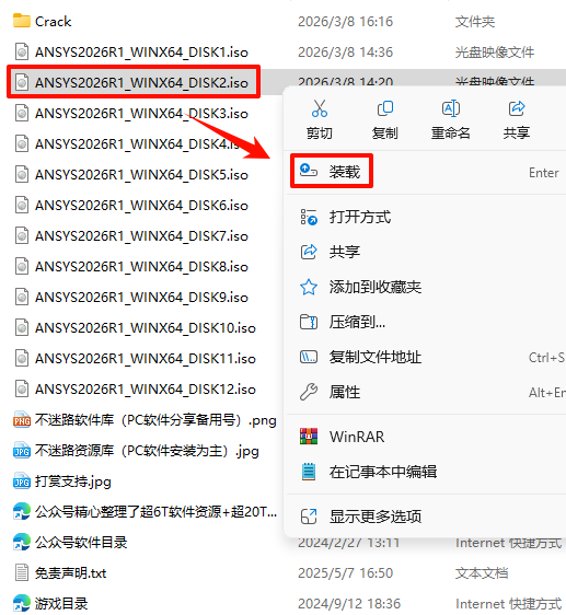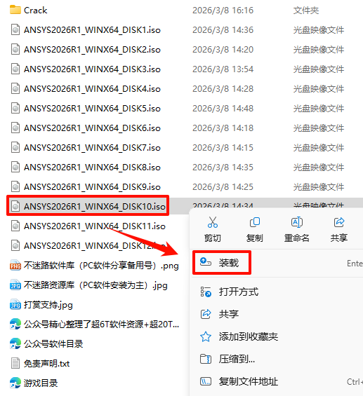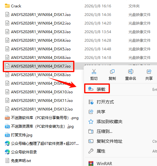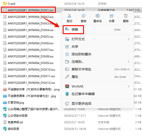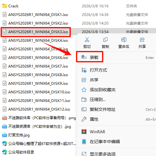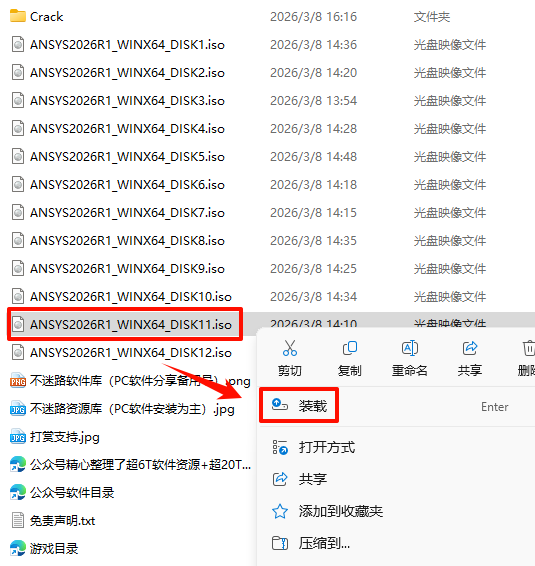 2.打开刚刚解压的文件夹,选中“ANSYS2026R1_WINX64_DISK1”iso文件,鼠标右键选择“装载”(如果没有“装载”选项的可以右键选择“打开方式—Windows资源管理器”打开)