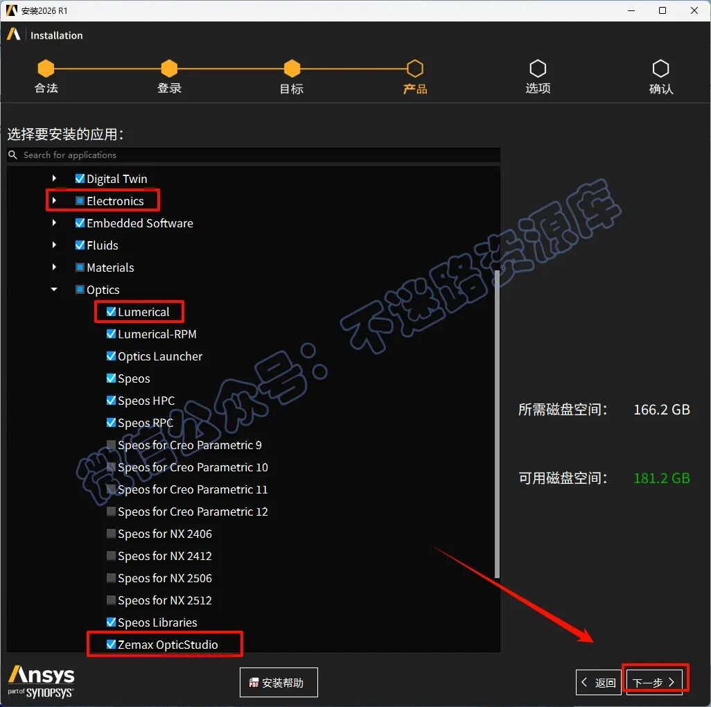 28.选择需要安装的产品,软件默认勾选Electronics、Lumerical、Zemax三个组件,可以根据自己的需要选择安装,全部安装需要250G的空间,点下“Optical”左边的三角展开符,这里包含了Lumerical、Speos、Speos for NX及Zemax等,点击“下一步”