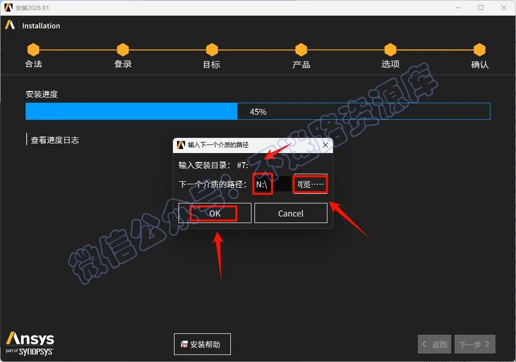 55.回到软件安装界面,点击“浏览”选择“N”盘(上一步显示的盘符),点击“选择文件夹”,点击“OK”,软件继续安装