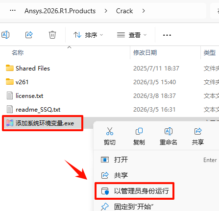77.返回“Crack”文件夹,选中“添加系统环境变量.exe”鼠标右键选择“以管理员身份运行”(黑框一闪而过是正常的)