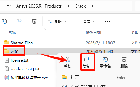 74.返回之前解压的“Ansys.2026.R1.Products”文件夹,双击打开“Crack”文件夹,选中“v261”文件,鼠标右键选择“复制”