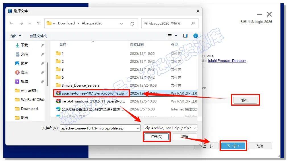 56.µã»÷“ä¯ÀÀ”£¬Ñ¡Öа²×°°üÖеēapache-tomee-10.1.3-microprofile.zip”ѹËõ°ü£¬µã»÷“´ò¿ª”£¬ µã»÷“ÏÂÒ»²½”