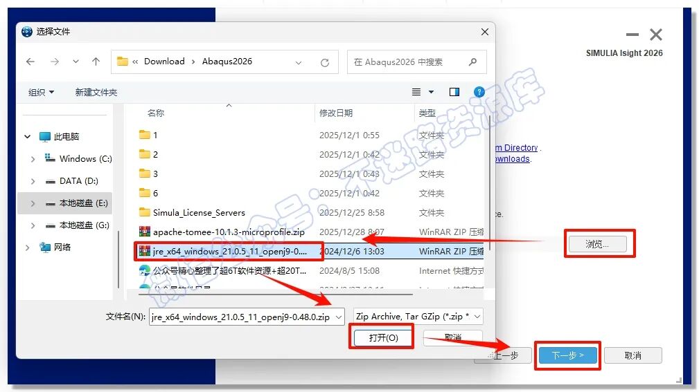54.µã»÷“ä¯ÀÀ”£¬Ñ¡Öа²×°°üÖеējre_x64_windows_21.0.5.11.openj9-0.48.0.zip”ѹËõ°ü£¬µã»÷“´ò¿ª”£¬µã»÷“ÏÂÒ»²½”