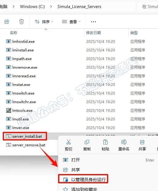4.´ò¿ª¸´ÖƵ½CÅ̵ēSimula_License_Server“Îļþ¼Ð£¬Êó±êÓÒ¼üµã»÷“server_install.bat”Ñ¡Ôñ“ÒÔ¹ÜÀíÔ±Éí·ÝÔËÐД