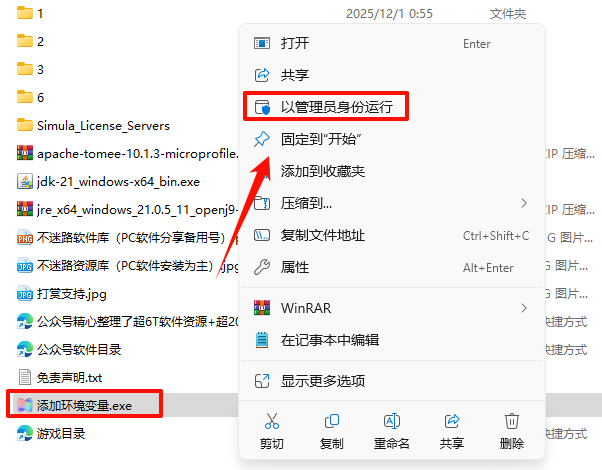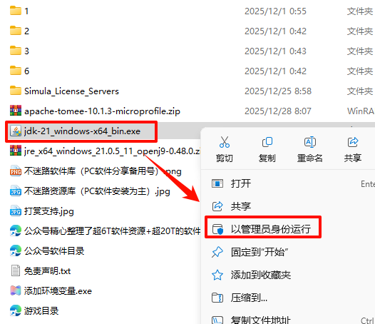 7.Êó±êÓÒ¼üµã»÷“jdk-21_windows-x64_bin.exe”Ñ¡Ôñ“ÒÔ¹ÜÀíÔ±Éí·ÝÔËÐД