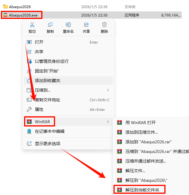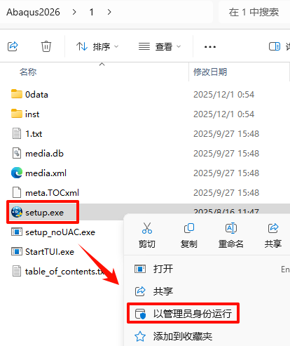 11.·µ»Ø½âѹµÄ”Abaqus2026“Îļþ¼Ð,Ë«»÷´ò¿ª“1”Îļþ¼Ð£¬Êó±êÓÒ¼üµã»÷“setup.exe”Ñ¡Ôñ“ÒÔ¹ÜÀíÔ±Éí·ÝÔËÐД