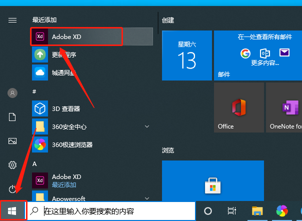 9.在桌面左下角的开始菜单中找到【Adobe XD】软件打开。