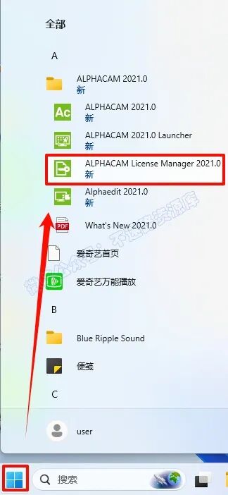 13.µã»÷“¿ªÊ¼”²Ëµ¥£¬µã»÷“ËùÓÐÓ¦ÓÔ£¬µã»÷Õ¹¿ª“AlphaCAM 2021”Îļþ¼Ð£¬µã»÷“ALPHACAM License Manager 2021”
