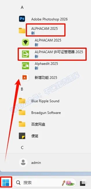 13.µã»÷“¿ªÊ¼”²Ëµ¥£¬µã»÷“ËùÓÐÓ¦ÓÔ£¬µã»÷Õ¹¿ª“AlphaCAM 2025”Îļþ¼Ð£¬µã»÷“ALPHACAM Ðí¿ÉÖ¤¹ÜÀíÆ÷ 2025”
