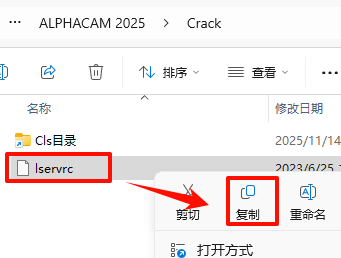 15.·µ»ØÖ®Ç°½âѹµÄ“ALPHACAM 2025”Îļþ¼Ð£¬´ò¿ª“Crack”Îļþ¼Ð£¬Ñ¡ÖГlservrc”Îļþ£¬Êó±êÓÒ¼üµã»÷“¸´ÖÆ”