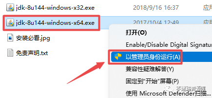 2.´ò¿ª¸Õ¸Õ½âѹµÄÎļþ¼Ð£¬Ë«»÷´ò¿ª“Java jdk”Îļþ¼Ð£¬ÕâÀïÐèÒª²é¿´µçÄԵIJÙ×÷ϵͳλÊý(µã»÷ÕâÀï²é¿´)£¬32λµÄÑ¡Ôñ”jdk-8u144-windows-x32.exe”£¬64λµÄÑ¡Ôñ”jdk-8u144-windows-x64.exe”£¬Êó±êÓÒ¼üÑ¡Ôñ“ÒÔ¹ÜÀíÔ±Éí·ÝÔËÐД
