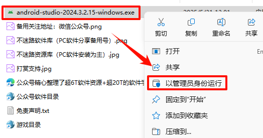 2.打开刚刚解压的文件夹,选中“android-studio-2024.3.2.15-windows.exe”文件,鼠标右键选择“以管理员身份运行”