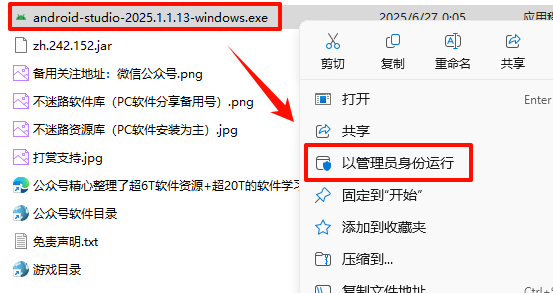 2.´ò¿ª¸Õ¸Õ½âѹµÄÎļþ¼Ð£¬Ñ¡ÖГandroid-studio-2025.1.1.13-windows.exe”Îļþ£¬Êó±êÓÒ¼üÑ¡Ôñ“ÒÔ¹ÜÀíÔ±Éí·ÝÔËÐД