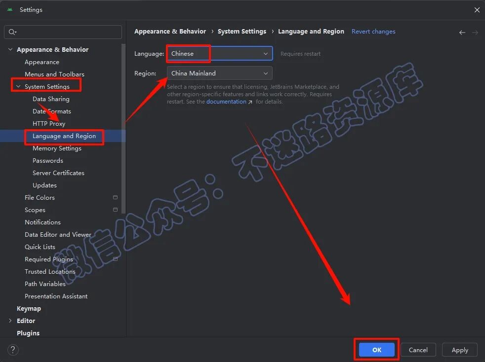 26.ÒÀ´Îµã»÷Õ¹¿ª“Appearance & Behavior——System Settings”£¬µã»÷“Language and Region”£¬ÓïÑÔLanguageÑ¡Ôñ“Chinese”£¬µã»÷“OK“
