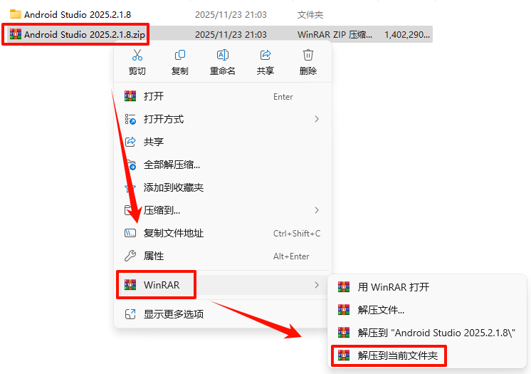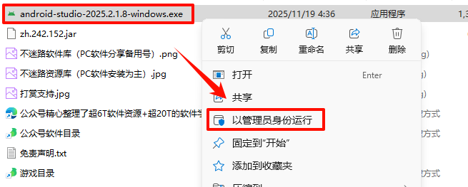 2.´ò¿ª¸Õ¸Õ½âѹµÄÎļþ¼Ð£¬Ñ¡ÖГandroid-studio-2025.2.1.8-windows.exe”Îļþ£¬Êó±êÓÒ¼üÑ¡Ôñ“ÒÔ¹ÜÀíÔ±Éí·ÝÔËÐД