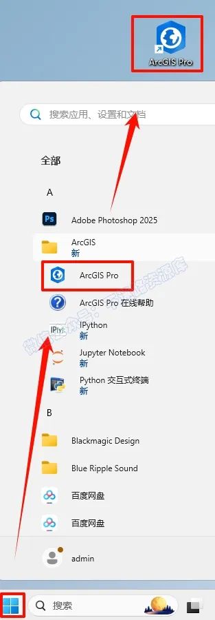 23.µã»÷“¿ªÊ¼“²Ëµ¥À¸£¬ÕÒµ½“ArcGIS Pro“Èí¼þ£¬Êó±ê×ó¼üÍÏ×§µ½×ÀÃæÉϼ´¿É´´½¨×ÀÃæ¿ì½Ý·½Ê½