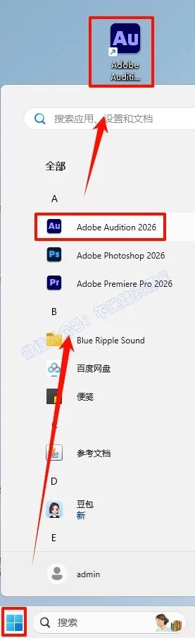 6.点击“开始“菜单栏,点击“所有应用“,找到“Adobe Audition“软件,鼠标左键拖拽到桌面上即可创建桌面快捷方式