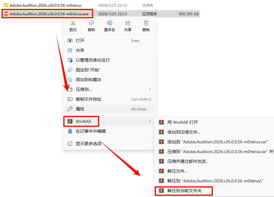 1.进入下载链接下载“Adobe.Audition.2026.v26.0.0.56-m0nkrus”安装包,选中下载的安装包,选中下载的压缩包,鼠标右键选择“解压到当前文件夹”