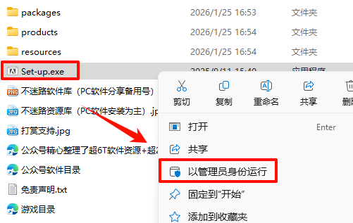2.打开刚刚解压的文件夹,鼠标右键点击“Set-up.exe”选择“以管理员身份运行”