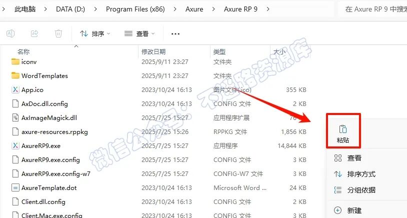 10.ÒÀ´Î´ò¿ªÈí¼þ°²×°Â·¾¶£ºD:\Program Files (x86)\Axure\Axure RP 9(²Î¿´µÚ5²½)£¬ÔÚ´ò¿ªµÄÎļþ¼Ð¿Õ°×´¦£¬Êó±êÓÒ¼ü“Õ³Ìù”¸Õ²Å¸´ÖƵÄÎļþ