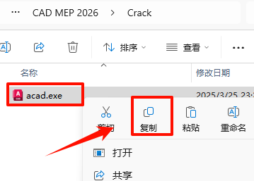 7.·µ»ØÖ®Ç°½âѹµÄ“CAD MEP 2026”Îļþ¼Ð£¬Ë«»÷´ò¿ª“Crack”Îļþ¼Ð£¬Êó±êÓÒ¼üµã»÷“acad.exe”Ñ¡Ôñ“¸´ÖÆ”