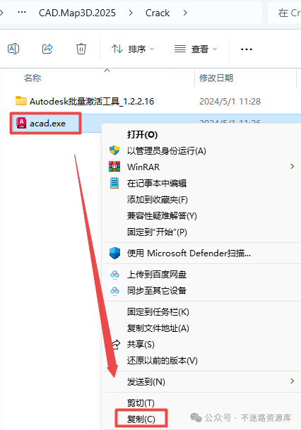 7.·µ»ØÖ®Ç°½âѹµÄ“CAD.Map3D.2025”Îļþ¼Ð£¬Ë«»÷´ò¿ª“Crack”Îļþ¼Ð£¬Êó±êÓÒ¼üµã»÷“acad.exe”Ñ¡Ôñ“¸´ÖÆ”