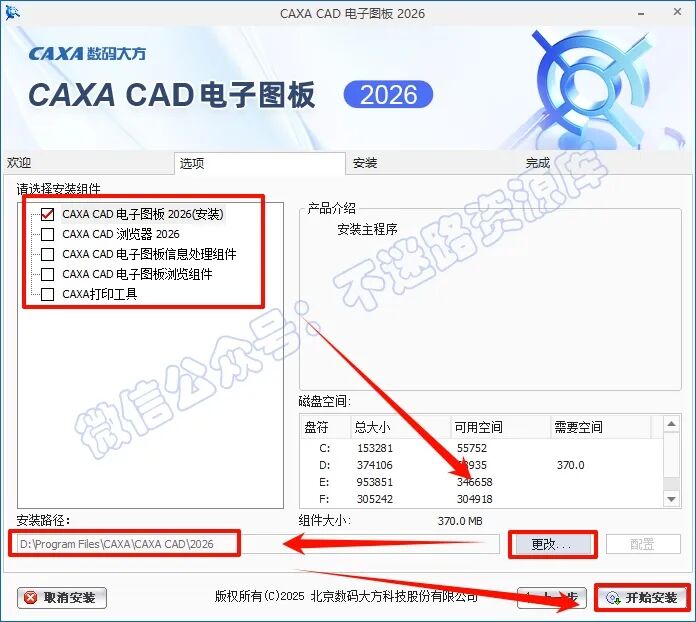 5.选择勾选需要安装的组件,点击“更改”可以选择软件安装路径,建议和教程中的保持一致,本例安装到D盘(将路径地址中的首字符C改为D表示安装到D盘,安装路径不要出现中文),点击“开始安装”