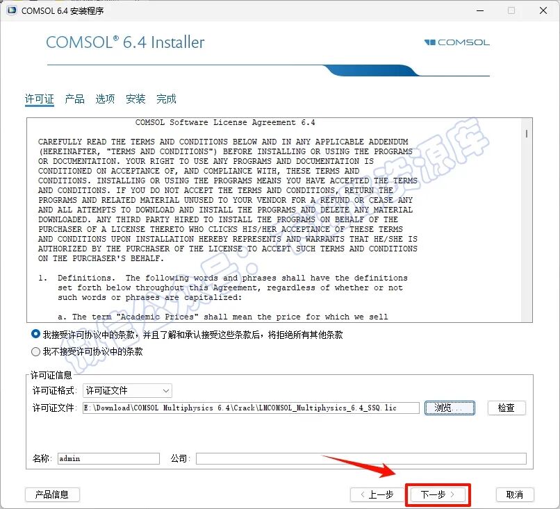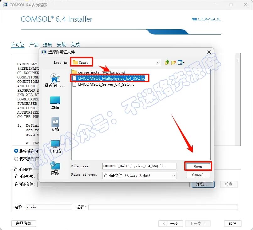6.ÕÒµ½½âѹºóµÄ“COMSOL Multiphysics 6.4”Îļþ¼Ð·¾¶ £¬´ò¿ª“Crack“Îļþ¼Ð£¬Ñ¡ÖГLMCOMSOL_Multiphysics_6.4_SSQ.lic“Ðí¿ÉÖ¤Îļþ£¬µã»÷“Open“