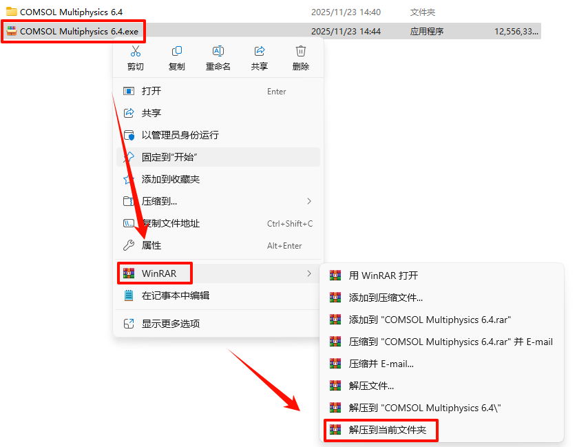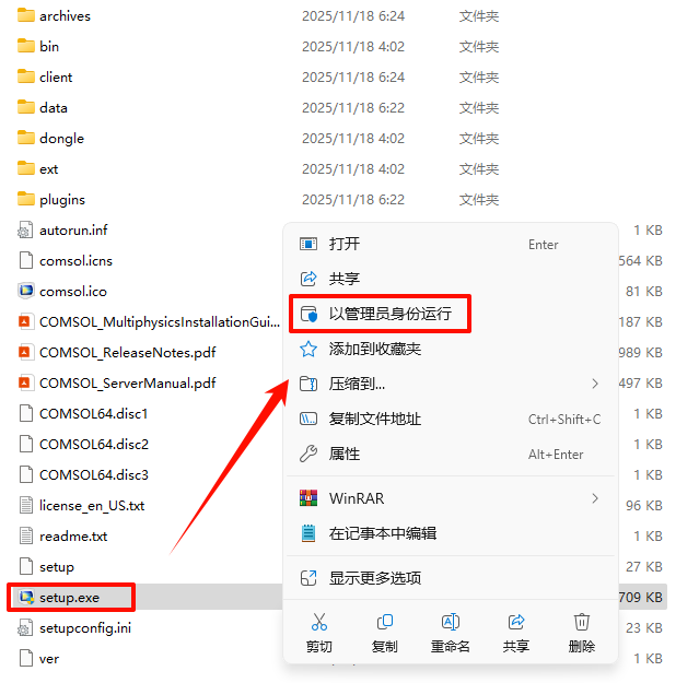 2.´ò¿ª¸Õ¸Õ½âѹµÄÎļþ¼Ð£¬Ë«»÷´ò¿ª“COMSOL.6.4.293_Setup”Îļþ¼Ð£¬Ñ¡ÖГSetup.exe”Îļþ£¬Êó±êÓÒ¼üÑ¡Ôñ“ÒÔ¹ÜÀíÔ±Éí·ÝÔËÐД