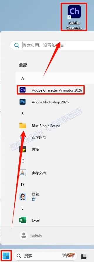 6.µã»÷“¿ªÊ¼“²Ëµ¥À¸£¬µã»÷“ËùÓÐÓ¦ÓÓ£¬ÕÒµ½“Adobe Character Animator“Èí¼þ£¬Êó±ê×ó¼üÍÏ×§µ½×ÀÃæÉϼ´¿É´´½¨×ÀÃæ¿ì½Ý·½Ê½