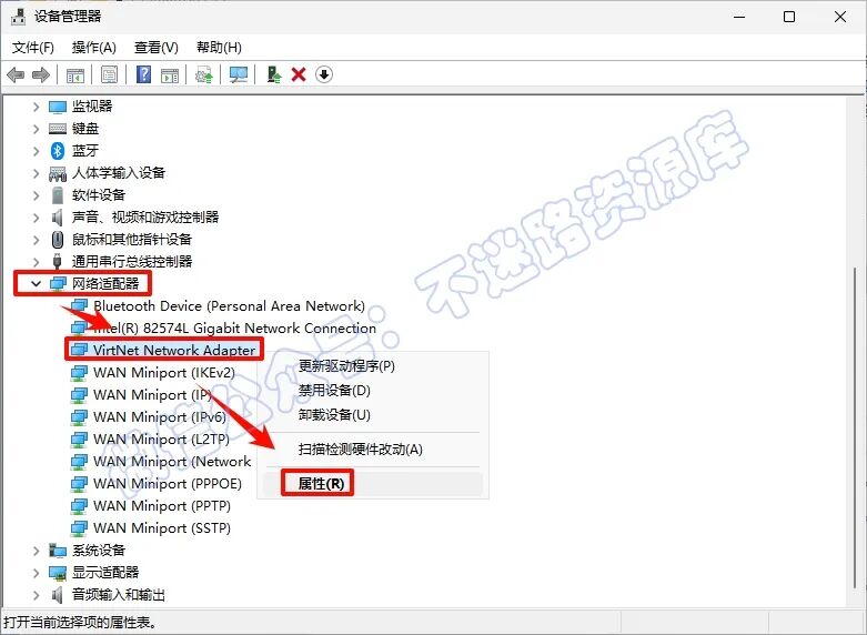 15.返回设备管理器,双击展开“网络适配器”,鼠标右键点击“VirtNet Network Adapter”选择“属性”