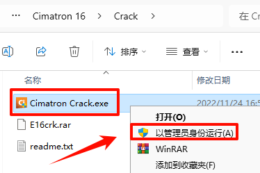 15.返回解压的”Cimatron 16“文件夹,双击打开”Crack“文件夹,选中”Cimatron Crack.exe“文件,鼠标右键选择“以管理员身份运行”