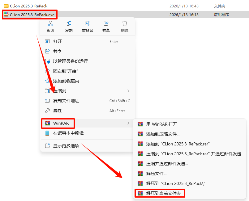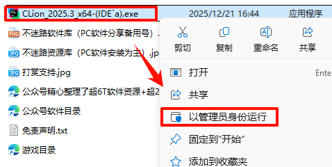 2.´ò¿ª¸Õ¸Õ½âѹµÄÎļþ¼Ð£¬Êó±êÓÒ¼üµã»÷“CLion_2025.3_x64-(IDE`a).exe”Ñ¡Ôñ“ÒÔ¹ÜÀíÔ±Éí·ÝÔËÐД