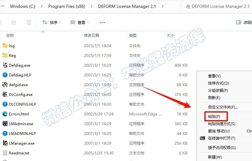 22.ÒÀ´Î´ò¿ªÎļþ¼Ð·¾¶£ºC:\Program Files (x86)\DEFORM License Manager 2.1£¬ÔÚÎļþ¼Ð¿Õ°×´¦£¬Êó±êÓÒ¼ü“Õ³Ìù”¸Õ²Å¸´ÖƵÄÎļþ
