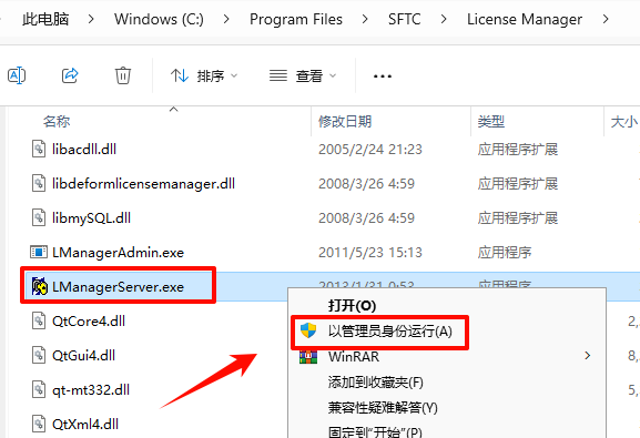 50.ÒÀ´Î´ò¿ªÎļþ¼Ð·¾¶£ºC:\Program Files\SFTC\License Manager£¬Ñ¡ÖГLManagerServer.exe”ÎļþÑ¡Ôñ“ÒÔ¹ÜÀíÔ±Éí·ÝÔËÐД