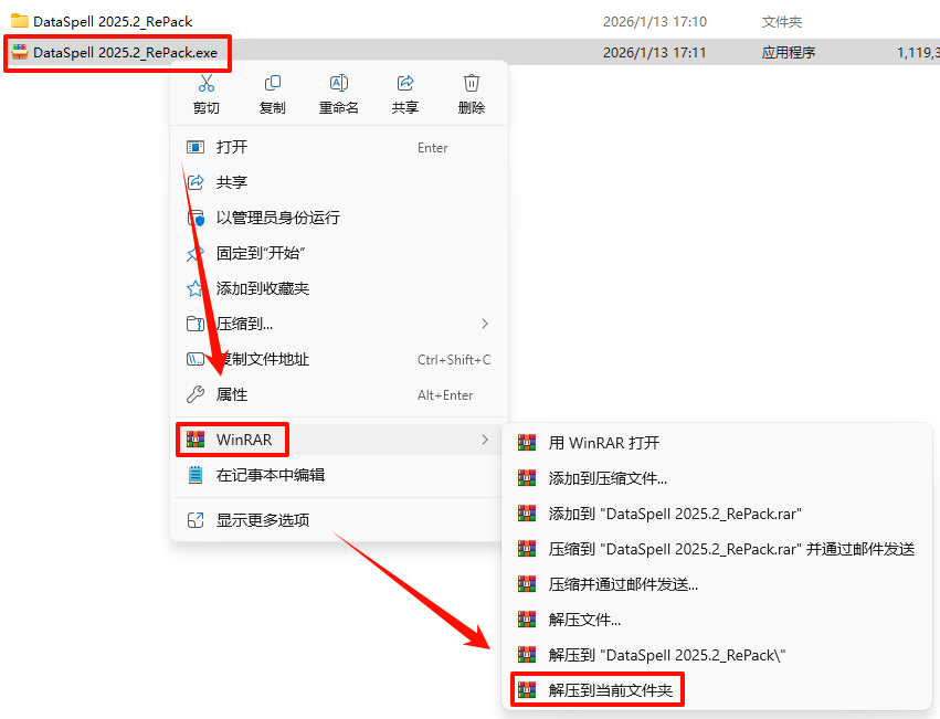 2.打开刚刚解压的文件夹,鼠标右键点击“DataSpell_2025.2.2_x64-(IDE`a).exe”选择“以管理员身份运行”