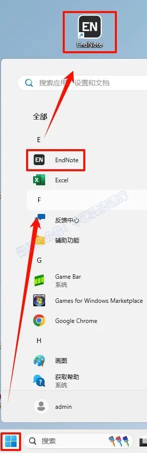 15.点击“开始“菜单栏,点击“所有应用“,找到“EndNote“软件,鼠标左键拖拽到桌面上即可创建桌面快捷方式