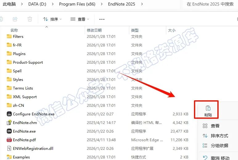 13.依次打开软件安装路径:D:\Program Files (x86)\EndNote 2025(参看第8步设置路径),在打开的文件夹空白处,鼠标右键“粘贴”刚才复制的文件