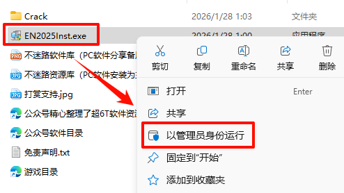 2.返回解压的文件夹,鼠标右键点击“EN2025.2Inst.exe”选择“以管理员身份运行”