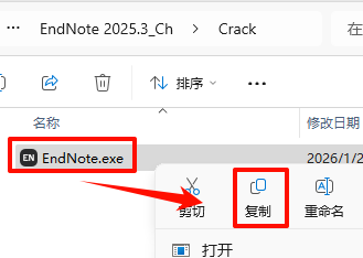 12.返回之前解压的“EndNote 2025.3_Ch”文件夹,双击打开“Crack”文件夹,选中全部文件,鼠标右键点击“复制”