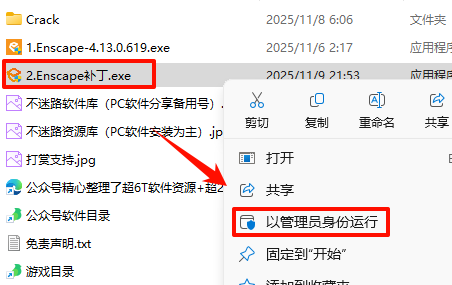 8.返回之前解压的“Enscape 4.13.0.619”文件夹,选中“2.Enscape补丁.exe”文件,鼠标右键选择“以管理员身份运行”