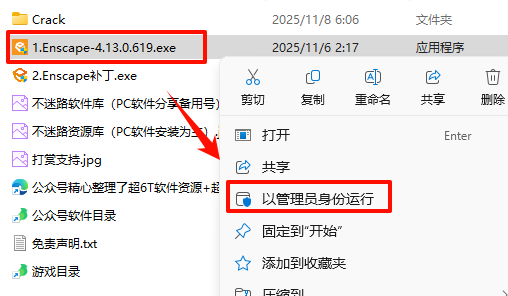 2.打开刚刚解压的文件夹,选中“1.Enscape-4.13.0.619.exe”文件,鼠标右键选择“以管理员身份运行”