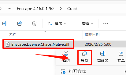 8.·µ»ØÖ®Ç°½âѹµÄ“Enscape 4.16.0.1262”Îļþ¼Ð£¬Ë«»÷´ò¿ª“Crack”Îļþ¼Ð£¬Ñ¡ÖГEnscape.License.Chaos.Native”Îļþ£¬Êó±êÓÒ¼üµã»÷“¸´ÖÆ”Îļþ¼Ð